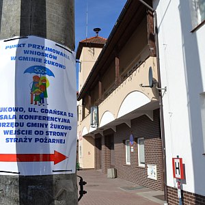 W Żukowie od rana tłumy. Urzędnicy mają pełne ręce roboty - jak już pisaliśmy, wydzielona została sala konferencyjna urzędu specjalnie po to, by usprawnić przyjmowanie wniosków. Na dworze, przed punktem przyjmowania wniosków, znajdują się specjalne plakaty, wskazujące mieszkańcom, gdzie składać pisma. Na złożenie wniosku w urzędzie oczekują kobiety z dziećmi, są też rodziny. Na korytarzach stoją wózki, a kolejka rozpoczyna się już na schodach.