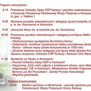 Program: godz. 12.45 zbiórka pocztów sztandarowych przy kościele parafialnym w Stężycy, godz. 13.00- - msza św. za Ojczyznę w kościele pw. św. Katarzyny Aleksandryjskiej, godz. 14.00 - złożenie wiązanki kwiatów przy figurze Matki Boskiej, godz. 14.30 - przemarsz sprzed kościoła pod amfiteatr w Stężycy, godz. 14.45 - uroczyste przekazanie i poświęcenie trzech nowych wozów strażackich, wystąpienia władz, gości, wręczenie odznaczeń i biesiada.