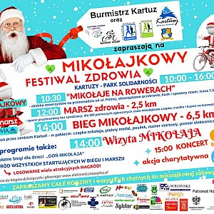 Głównym punktem wydarzenia będzie mikołajkowy bieg zdrowia, w którym wystartuje 600 mikołajów, którzy opanują główne ulice Kartuz. W godzinach porannych odbędzie się parada mikołajów na rowerach, a w samo południe mikołajkowy marsz zdrowia na dystansie 2,5 km. Godzinę później w parku Solidarności 350 dzieci startujących w 6 kategoriach wiekowych będą gonić renifera, bałwanka i oczywiście mikołaja.