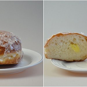 Bar Mestwin sprzedaje dziś pączki o smaku różanym, adwokatowym i wieloowocowym. My trafiliśmy na pączka z nadzieniem adwokatowym.
