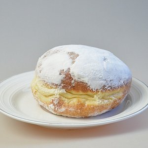 *Wygląd:* Okrągły, tradycyjny, z jasną obrączką, posypany cukrem pudrem.