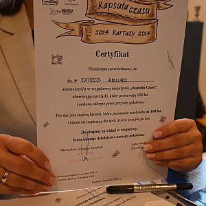 - Z inicjatywy Artura Sochy mieszkańca Łapalic, pasjonata historii i radnego Rady Powiatu Kartuskiego, przygotowaliśmy kapsułę czasu i złożyliśmy w niej ważny depozyt – pamiątki dla pokoleń naszych następców. Kartuska kapsuła jest informacją dla Was, mieszkańców Stolicy Kaszub z odległej przyszłości. Jest też wyrazem naszego szacunku do całego miasta, jego historii, przeszłości i przyszłości - list o takiej treści złożył w kapsule czasu burmistrz Kartuz. - Przekazaliśmy również informację o projekcie, który napawa nas szczególną dumą, dotyczący kompleksowej rekultywacji jezior: Mielenko, Karczemne, Klasztorne Małe i Klasztorne Duże w Kartuzach. Dzięki temu niezwykle istotnemu przedsięwzięciu oczyściliśmy nasze piękne jeziora, a mieszkańcy i turyści znów mogą cieszyć się w pełni ich urokami. Mamy nadzieję, że inwestycje, które wówczas poczyniliśmy i nad którymi pracujemy, służą Wam do dziś. Trudno nam sobie wyobrazić Kartuzy w odległej przyszłości. Ufamy jednak, że historia będzie łaskawa dla Polski, Kaszub, gminy Kartuzy, że ominą nas konflikty, wojny i katastrofy. Mamy nadzieję, że wiadomość ta za wiele, wiele lat dotrze do szczęśliwych i cieszących się wspaniałym życiem Polaków, Kaszubów, mieszkańców Ziemi Kartuskiej.
