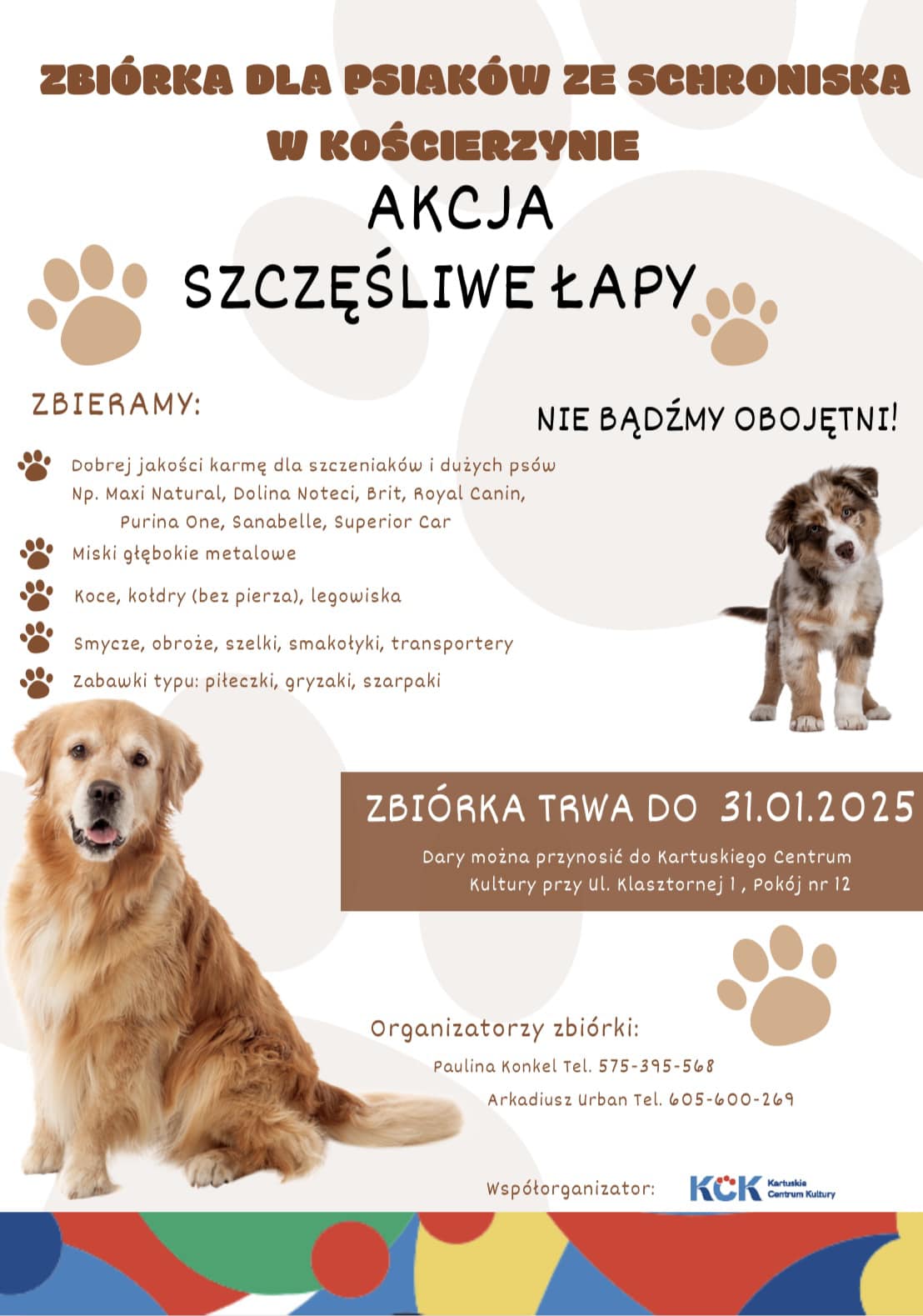 W Kartuskim Centrum Kultury trwa akcja "Szczęśliwe łapy". Mieszkańcy i odwiedzający placówkę mogą przynosić dary dla bezdomniaków: karmę, zabawki, kocyki, transportery itp. Wszystkie rzeczy trafią do schroniska dla bezdomnych zwierząt w Kościerzynie.