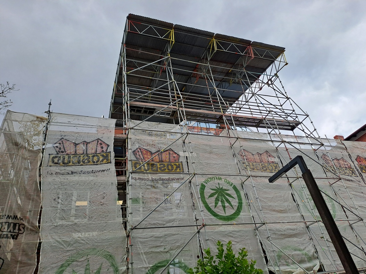 W związku z prowadzonymi robotami wybudowano specjalne zadaszenie nad budynkiem.