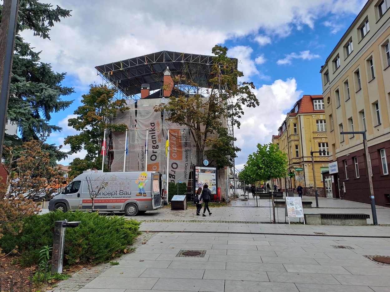 Nad budynkiem Starostwa Powiatowego w Kartuzach przy ul. Dworcowej powstała specjalna konstrukcja z dodatkowym zadaszeniem. To część prac związanych z remontem budynku, a przede wszystkim - wymianą dachu.