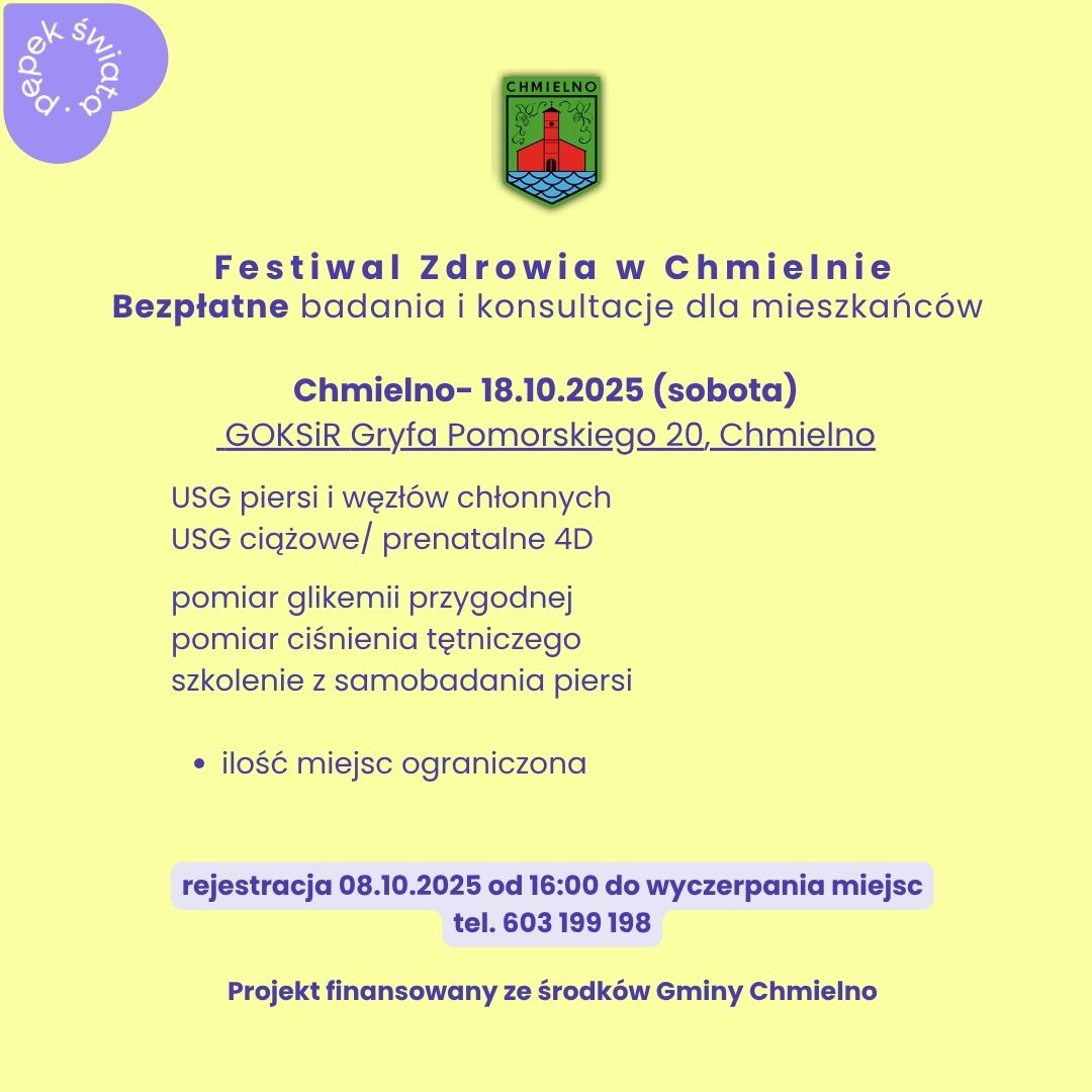 Wydarzenie odbędzie się w sobotę, 18 października w Gminnym Ośrodku Kultury, Sportu i Rekreacji w Chmielnie przy ul. Gryfa Pomorskiego 20. Wydarzenie skierowane jest do wszystkich mieszkańców gminy Chmielno, którzy chcą zadbać o swoje zdrowie, uzyskać fachowe porady medyczne i wykonać bezpłatne badania diagnostyczne.