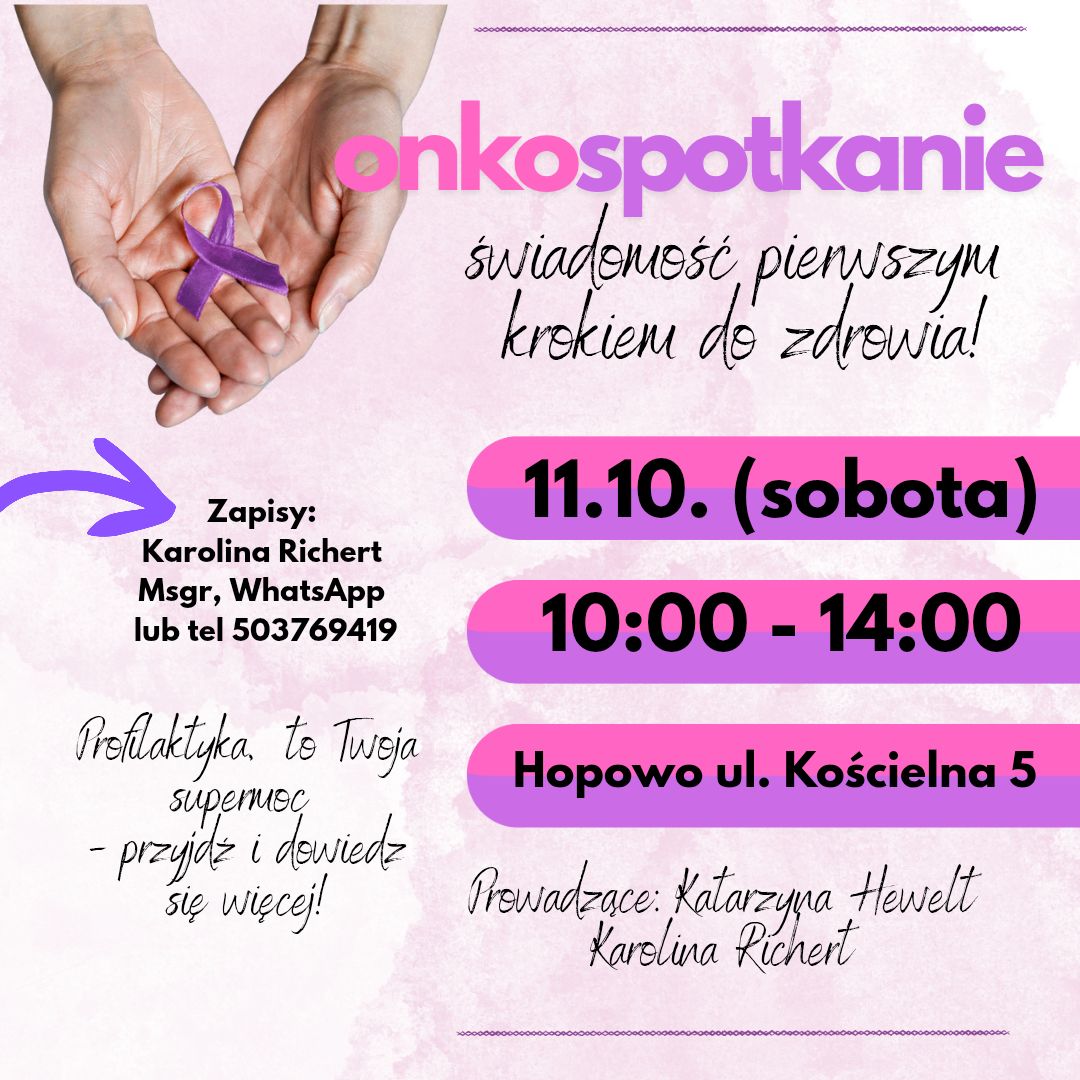 W najbliższą sobotę, 11 października, w Hopowie przy ul. Kościelnej 5 odbędzie się wyjątkowe wydarzenie pod nazwą „Onkospotkanie”. To inicjatywa poświęcona profilaktyce nowotworów, w szczególności raka piersi, raka szyjki macicy oraz wirusa HPV.