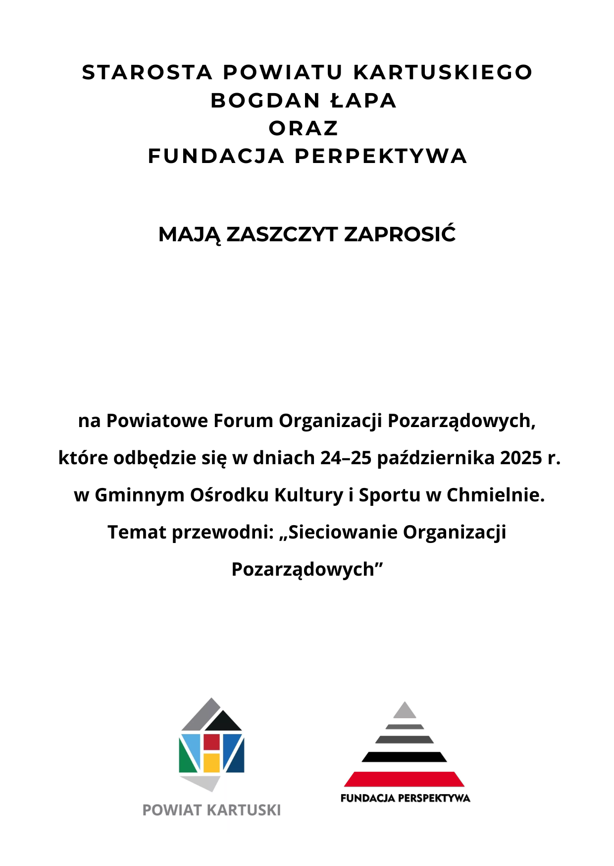 Starosta Kartuski Bogdan Łapa oraz Fundacja Perspektywa zapraszają na Powiatowe Forum Organizacji Pozarządowych, które odbędzie się w dniach 24-25 października w Gminnym Ośrodku Kultury i Sportu w Chmielnie. Temat przewodni to "Sieciowanie Organizacji Pozarządowych".