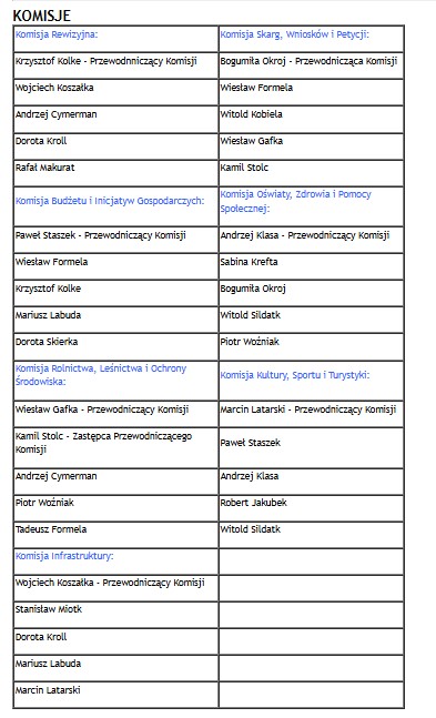 Krzysztof Kolke - przewodniczący Komisji Rewizyjnej, Bogumiła Okroj - przewodnicząca Komisji Skarg Wniosków i Petycji, Paweł Staszek - przewodniczący Komisji Budżetu i Inicjatyw Gospodarczych, Andrzej Klasa - przewodniczący Komisji Oświaty, Zdrowia i Pomocy Społecznej, Wiesław Gafka - przewodniczący Komisji Rolnictwa, Leśnictwa i Ochrony Środowiska, Marcin Latarski - przewodniczący Komisji Komisji Kultury, Sportu i Turystyki oraz Wojciech Koszałka - przewodniczący Komisji Infrastruktury - oni wszyscy inkasują więc rocznie po 21 600 zł.