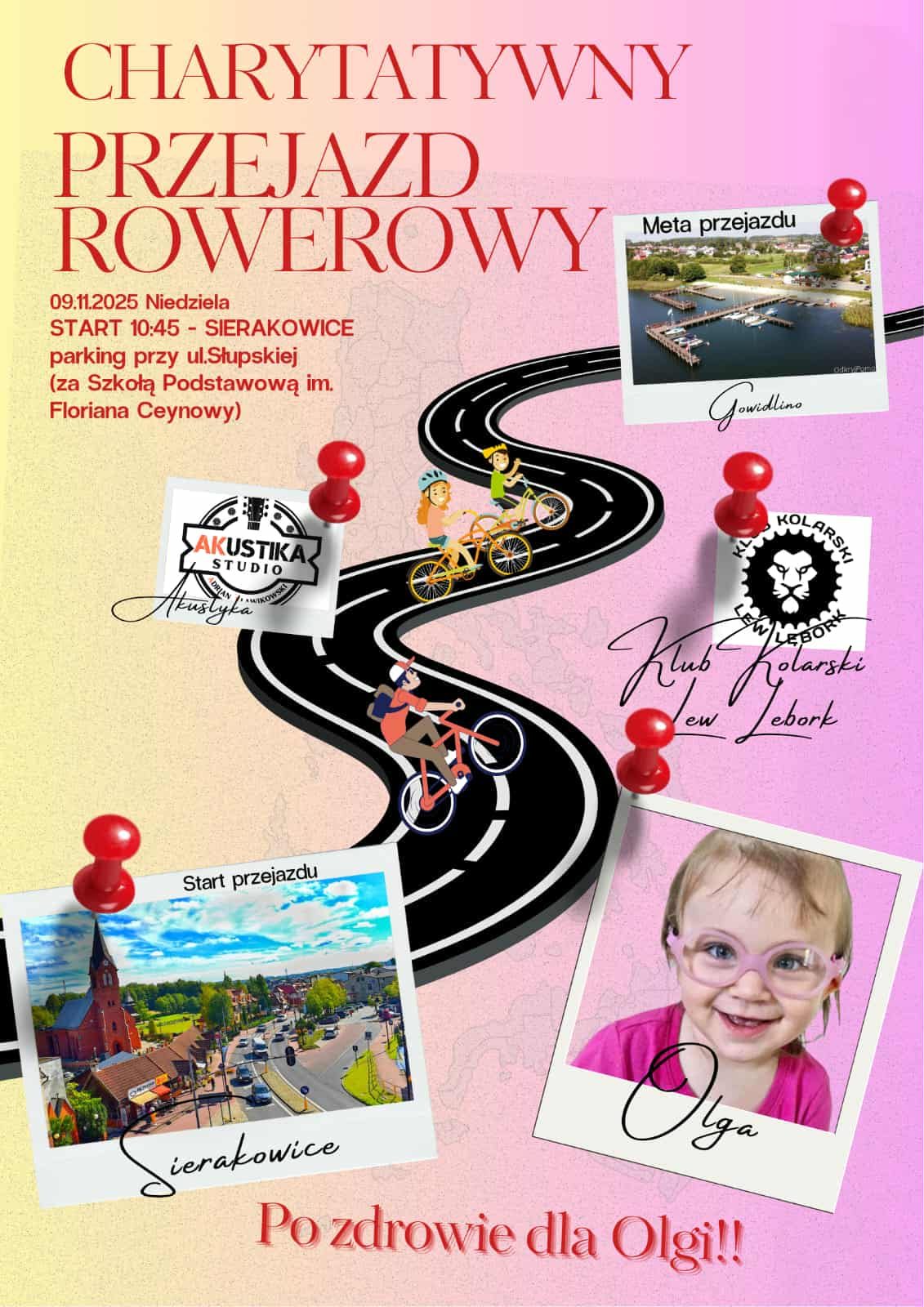 Organizowany jest też charytatywny przejazd rowerowy. Wydarzenie odbędzie się w niedzielę 9 listopada. Start w Sierakowicach, a meta - w Gowidlinie. Przejazd odbywa się pod hasłem "Po zdrowie dla Olgi". Jak podkreślają organizatorzy, każda złotówka to bezpośrednie wsparcie małej Olgi i pomoc w jej rehabilitacji.