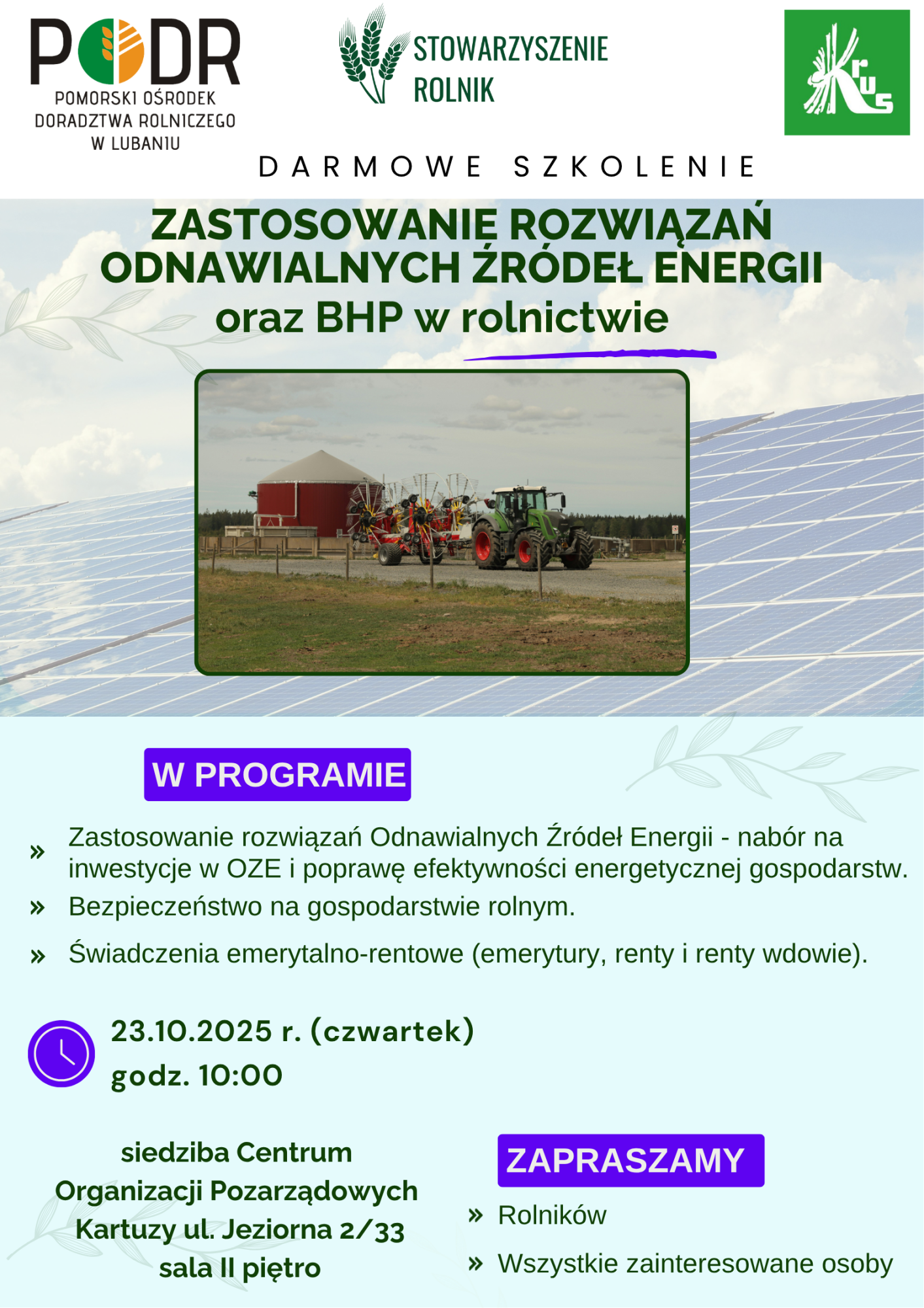 23 października 2025 r. (czwartek) o godz. 10:00 w Centrum Organizacji Pozarządowych w Kartuzach, ul. Jeziorna 2 odbędzie się kolejne szkolenie dla rolników. Tym razem tematem spotkania będzie m.in. zastosowanie rozwiązań OZE w gospodarstwach rolnych.