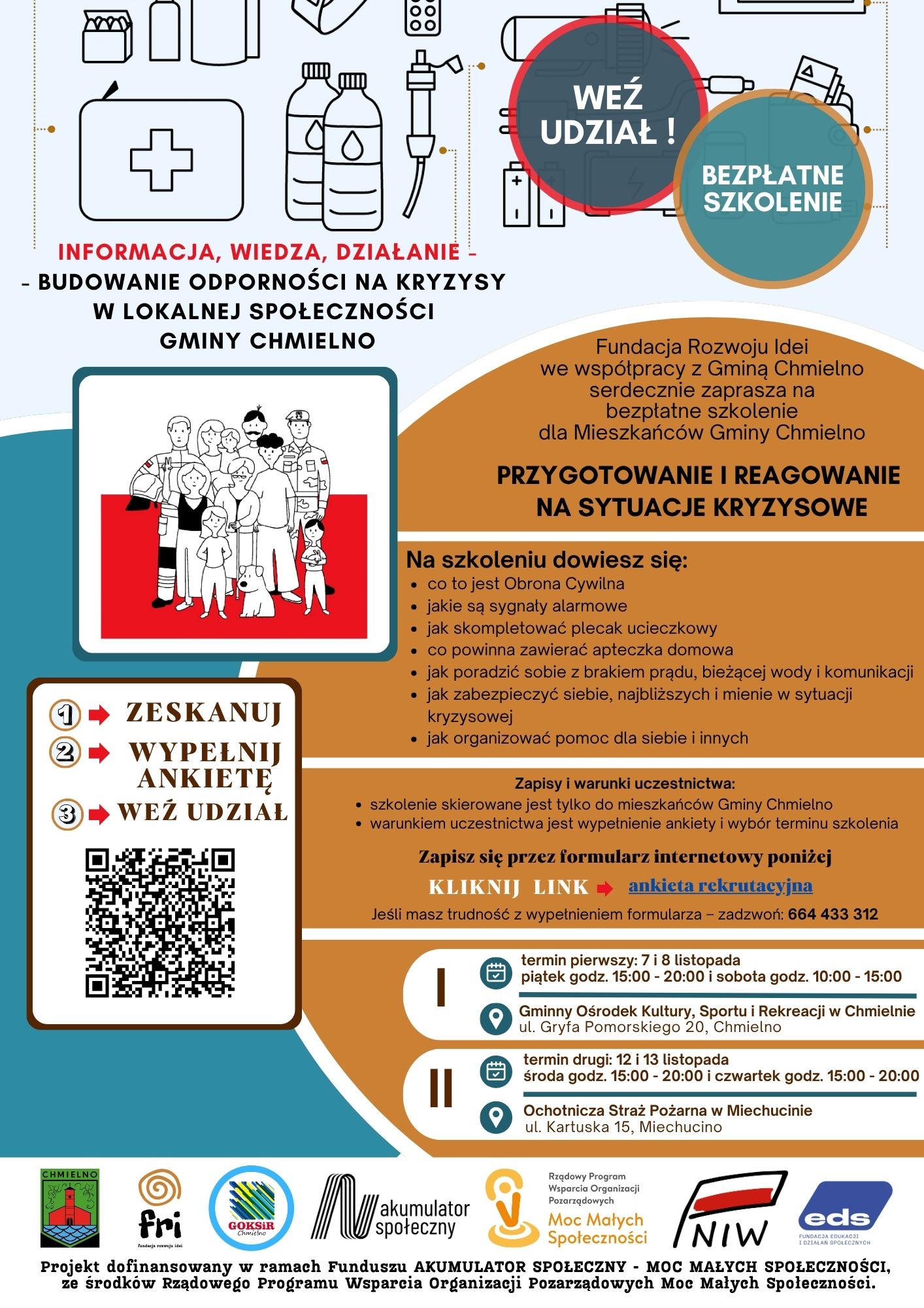 Fundacja Rozwoju Idei otrzymała dofinansowanie na realizację niezwykle potrzebnego przedsięwzięcia - szkolenia dla mieszkańców gminy Chmielno "Przygotowanie i reagowanie na sytuacje kryzysowe". Wydarzenie jest bezpłatne, trwają zapisy.