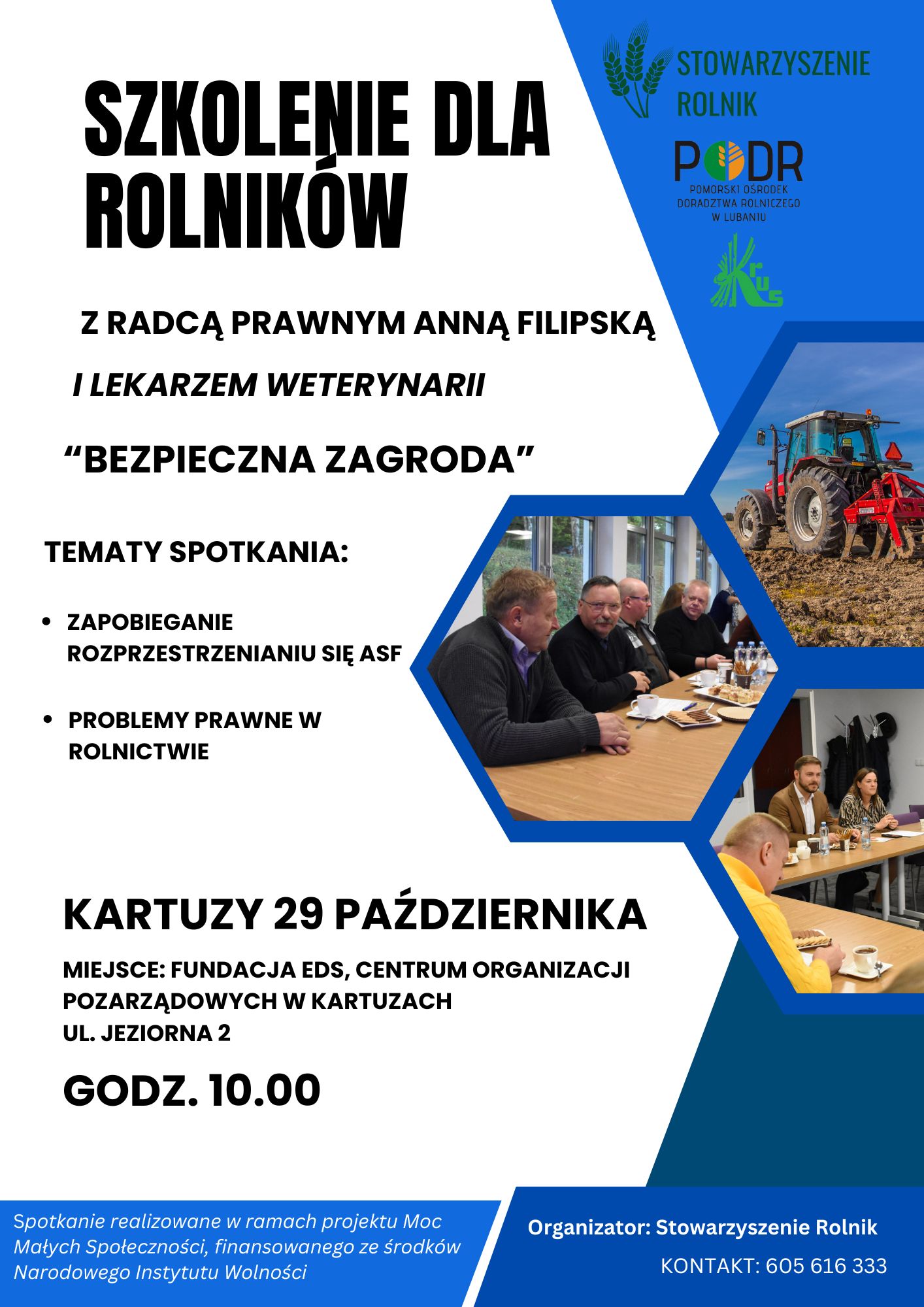 Stowarzyszenie "Rolnik" zaprasza na kolejne z cyklu szkoleń dla właścicieli gospodarstw. Tym razem poruszone zostaną kwestie prawne i problemy, z którymi borykają się rolnicy, ale będzie też dyskusja o zapobieganiu rozprzestrzeniania się ASF.