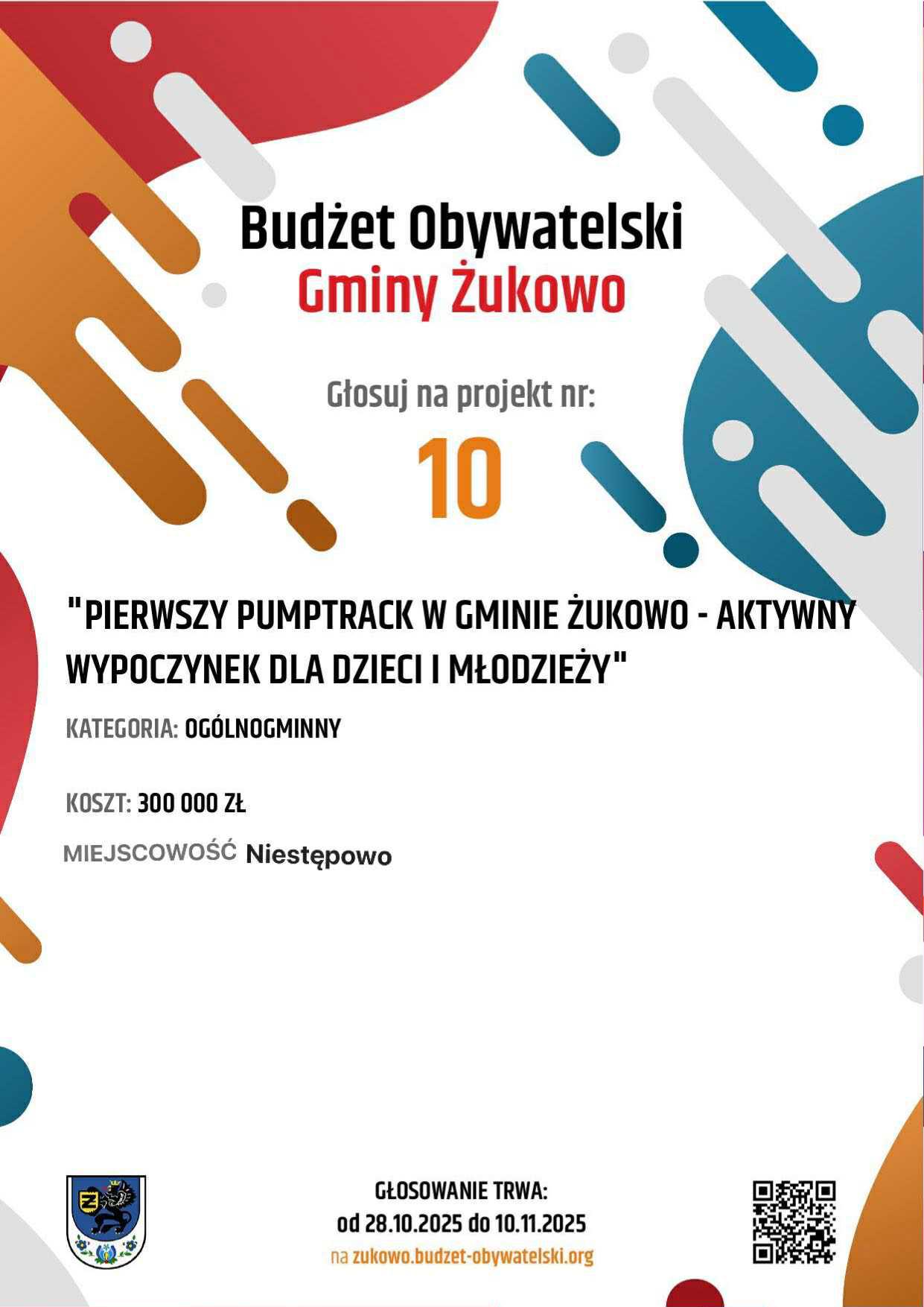Głosowanie trwa do 10 listopada 2025 roku. Głosować można w prosty sposób - elektronicznie za pomocą formularza dostępnego od 1 dnia głosowania (28.10.) na stronie www.zukowo.budzet-obywatelski.org.