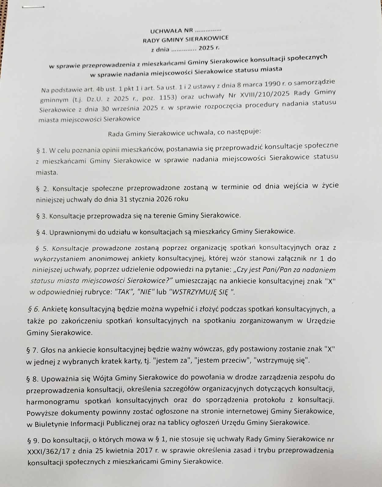 Przygotowano projekt uchwały zawierający informację o konsultacjach społecznych. Dołączono też formularz ankiety, która ma być rozdawana mieszkańcom podczas spotkań. Radni mają się nim zająć na najbliższej sesji.