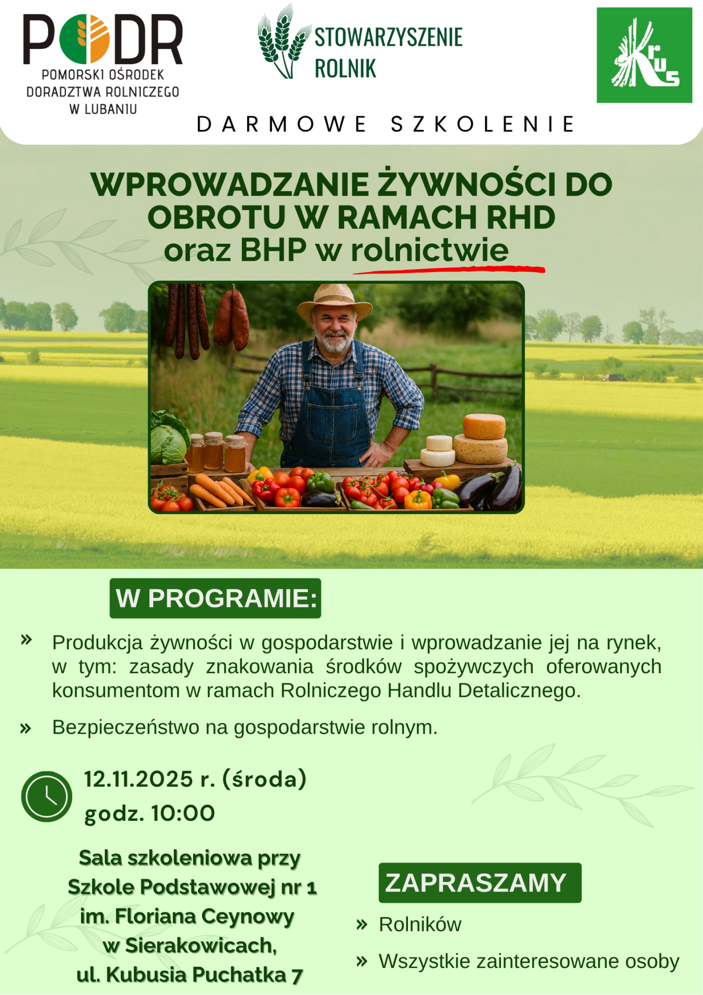 Już 12 listopada (środa) w Sierakowicach odbędzie kolejne z cyklu szkoleń dla rolników. Tym razem tematem spotkania będzie m.in. kwestia wprowadzania żywności do obrotu w ramach Rolniczego Handlu Detalicznego.