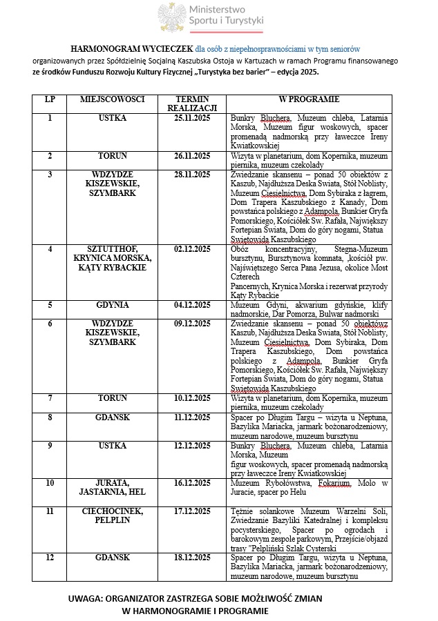 Każda z wycieczek będzie miała charakter edukacyjno-krajoznawczy, a program zostanie dostosowany do możliwości osób z niepełnosprawnościami. Udział w wyjazdach będzie bezpłatny, a skorzystać z nich będą mogły przede wszystkim osoby z gmin Kartuzy i Chmielno.
