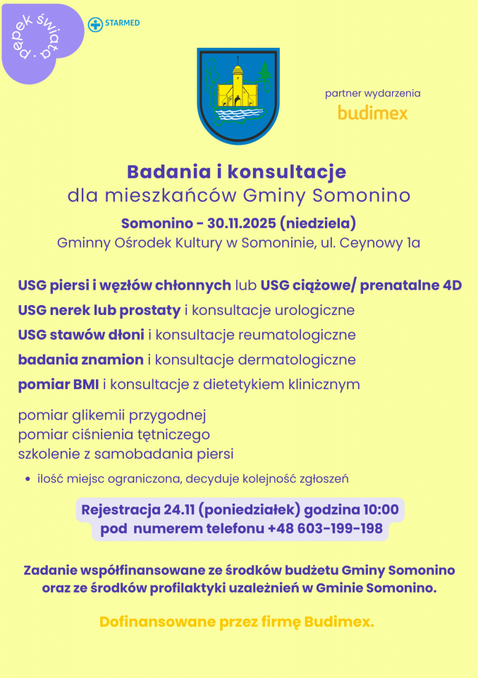 W niedzielę 30 listopada w Gminnym Ośrodku Kultury w Somoninie, ul. Ceynowy 1a, będzie można skorzystać z szeregu badań i konsultacji ze specjalistami. To świetna okazja, by zadbać o zdrowie bez żadnych kosztów.