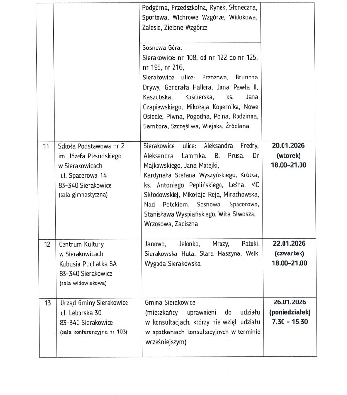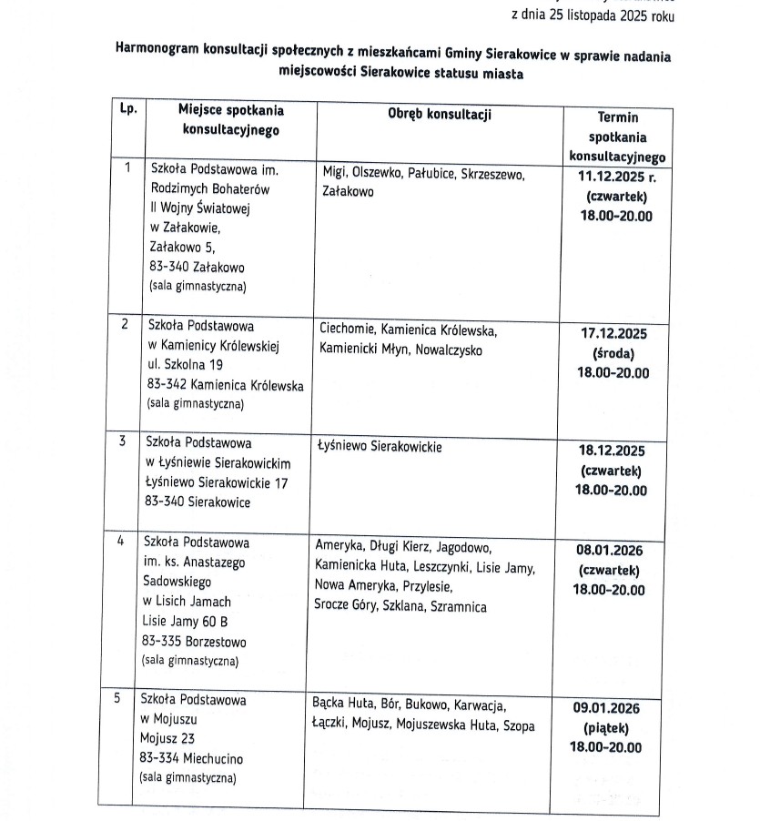 Urząd Gminy Sierakowice opublikował harmonogram i zasady prowadzenia konsultacji społecznych ws. nadania Sierakowicom praw miejskich. Wbrew wcześniejszym zapowiedziom spotkań nie będzie 14 lecz 12. Dodatkowo ankiety będzie można składać w Urzędzie Gminy.