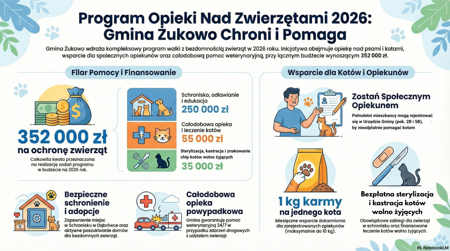 Na realizację zaplanowanych zadań gmina Żukowo chce przeznaczyć łącznie 352 000 zł. Projekt programu obejmuje szeroki zakres działań, które mają kompleksowo odpowiadać na problem bezdomności zwierząt.