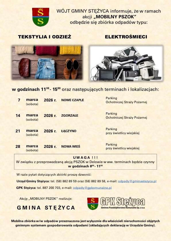 Gmina Stężyca informuje także, że w dniach zbiórek PSZOK w Delowie będzie czynny w godzinach 8:00 – 11:00. Mobilna zbiórka przeznaczona jest wyłącznie dla właścicieli nieruchomości objętych gminnym systemem gospodarowania odpadami.