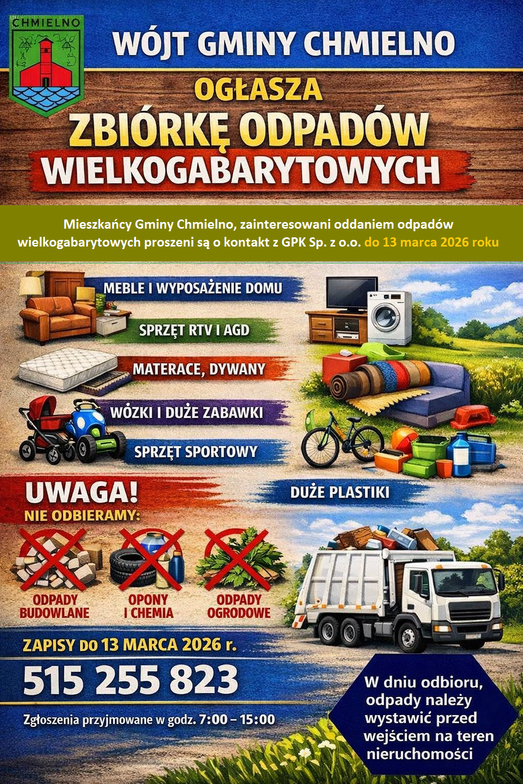Zgłoszenia bezpłatnego wywozu są przyjmowane telefonicznie pod numerem 515 255 823 do 13 marca, w dni robocze w godzinach od 7:00 do 15:00. Jak podaje Urząd Gminy, termin zbiórki odpadów wielkogabarytowych zostanie uzgodniony telefonicznie z pracownikiem GPK w Chmielnie.