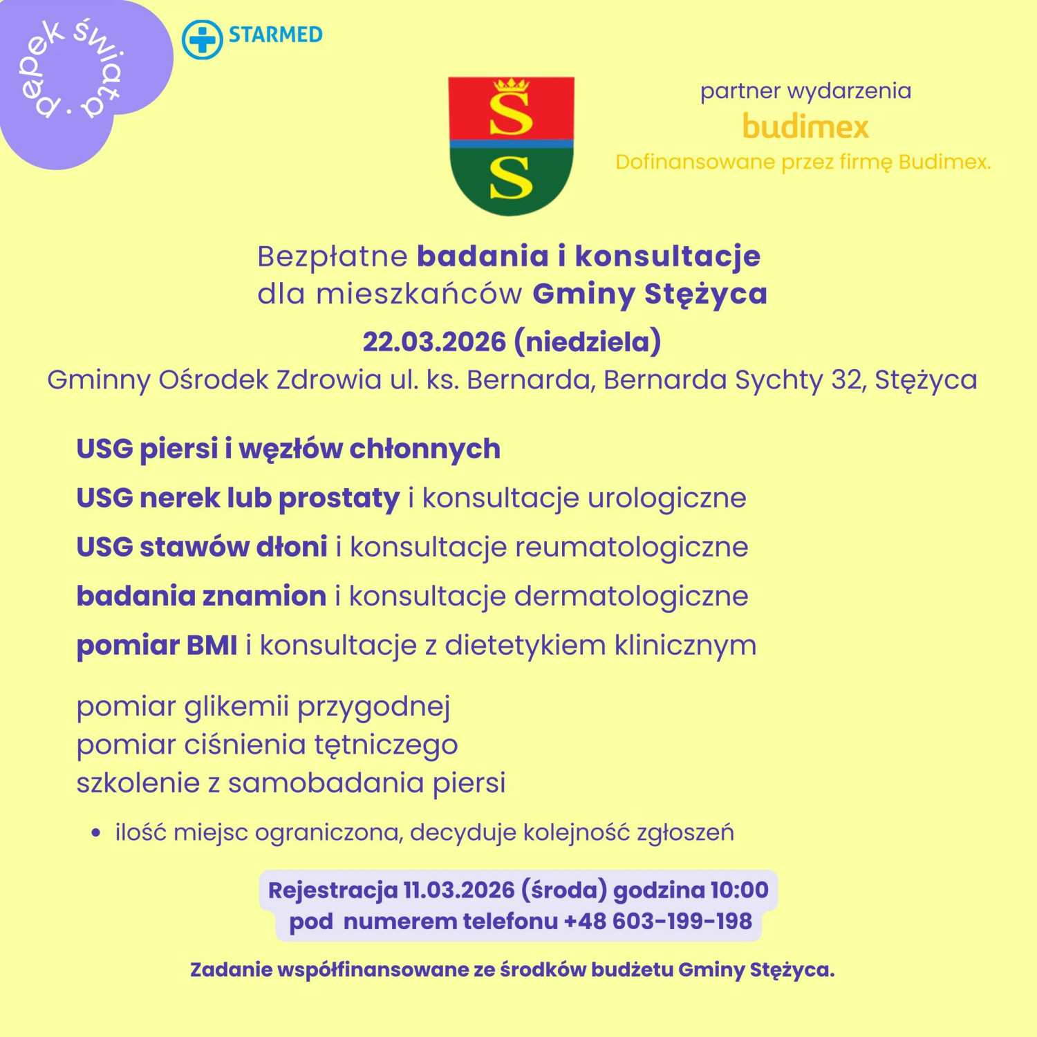 Mieszkańcy Gminy Stężyca będą mieli okazję bezpłatnie skorzystać z szeregu badań diagnostycznych oraz konsultacji specjalistycznych. Akcja profilaktyczna odbędzie się 22 marca 2026 roku (niedziela) w Gminnym Ośrodku Zdrowia w Stężycy. Liczba miejsc jest ograniczona, dlatego o udziale zdecyduje kolejność zgłoszeń.