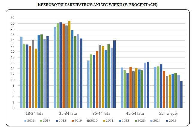 Na koniec 2025 roku w rejestrach znajdowało się 381 osób długotrwale bezrobotnych, czyli takich, które pozostawały bez pracy łącznie ponad 12 miesięcy w ciągu ostatnich dwóch lat (z wyłączeniem okresów stażu i przygotowania zawodowego). W tej grupie wyraźnie przeważały kobiety – było ich 263, co stanowi 69,0%, podczas gdy mężczyzn było 118, czyli 31,0%.