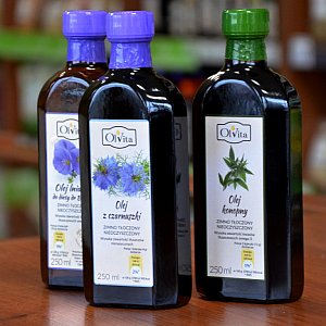 - oleje zimno-tłoczone: konopny, z czarnuszki, z pestek dyni, lniany, słonecznikowy, z orzecha włoskiego, orzechów makadamia, otropestu, z pestek moreli, wiesiołka.