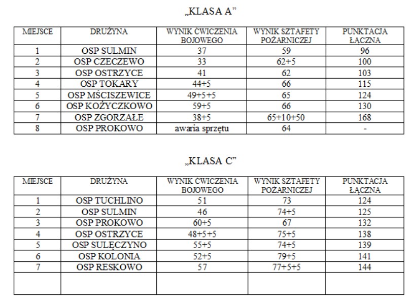 W zawodach wzięło udział 19, w tym 7 kobiecych. Najlepsze okazały się drużyny z OSP Sulmin oraz OSP Prokowo (ćwiczenie alarmowo-bojowe) oraz OSP Czeczewo i OSP Sulęczyno (musztra). Drużyny rywalizowały w dwóch kategoriach: klasa A - członkowie czynni, klasa C - kobiety.