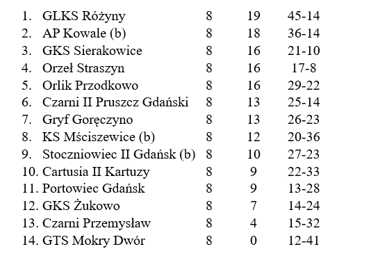 Tabela drugiej grupy gdańskiej A klasy po ośmiu kolejkach. Do zakończenia rundy jesiennej pozostało jeszcze pięć spotkań. Obecna sytuacja w tabeli może więc jeszcze się zmienić. Na ten moment jednak zespół z Sierakowic spisuje się bardzo dobrze. Najbliższe mecze pokażą o co w tym sezonie będą walczyć. Pierwszy sprawdzian już wkrótce.