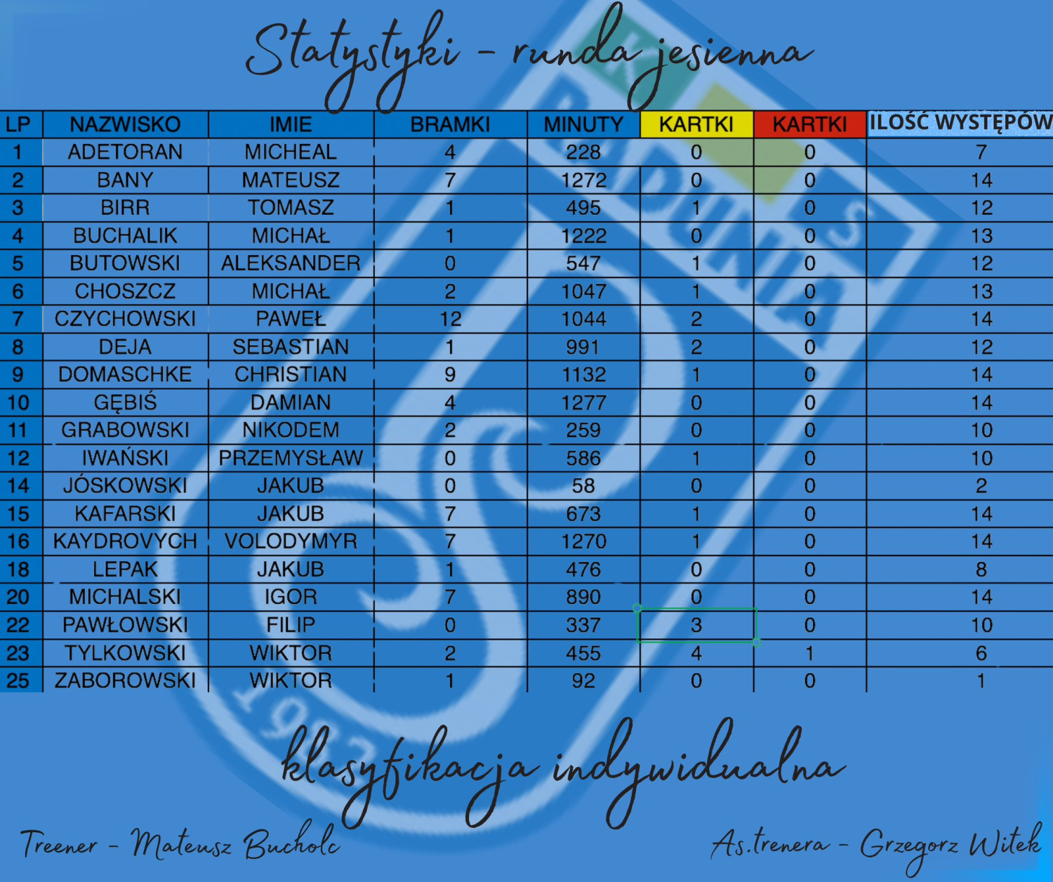 Po rundzie jesiennej najlepszym strzelcem zespołu jest Paweł Czychowski, który zdobył dwanaście bramek. Do Stężycy trafił on we wspomnianej wcześniej przerwie zimowej z czwartoligowego Jaguara Gdańsk. Drugim najlepszym snajperem z dziewięcioma trafieniami jest Christian Domaschke. Po siedem na swoim koncie mają zaś Mateusz Bany, Jakub Kafarski oraz Volodymyr Kaydrovych.