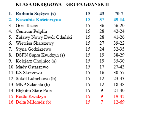Po rundzie jesiennej Radunia ma sześć punktów przewagi nad drugą w tabeli Kaszubią Kościerzyną oraz siedem nad trzecim Gryfem Tczew. Zgodnie z wcześniejszymi przypuszczeniami są to ich najwięksi rywale w drodze do szybkiego powrotu do czwartej ligi. Jesienią w obu spotkaniach górą była Radunia, pokonując Gryfa 2-1 oraz Kaszubię 3-1. Warto dodać, że oba swoje mecze rozegrała na wyjeździe.