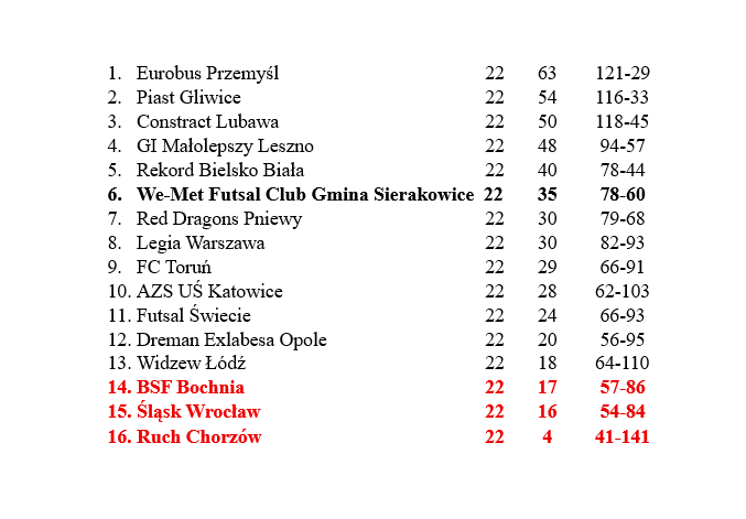 Po 22 kolejkach We-Met Futsal Club Gmina Sierakowice ma nadal 35 punktów. Kolejną szansę na poprawę swojej sytuacji ma już za tydzień, w której czeka ich wyjazdowe starcie z Ruchem Chorzów. W najbliższej rywalizacji o punkty teoretycznie powinno być łatwiej, ponieważ Ruch z dorobkiem zaledwie czterech oczek zamyka ligową tabelę.