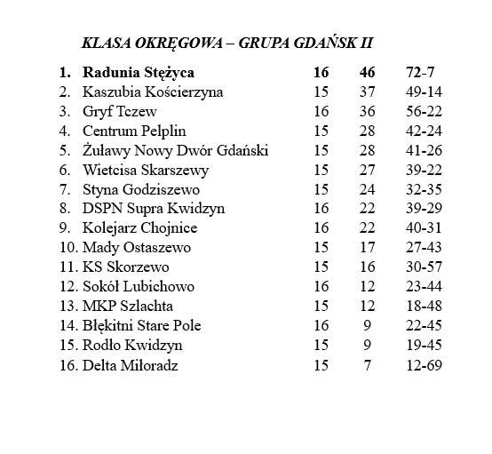 Przed Radunią bardzo ważna runda, w której celem jest utrzymanie pierwszej pozycji w tabeli i bezpośredni awans do czwartej ligi. Nad najgroźniejszym rywalem – Kaszubią Kościerzyną ma aktualnie dziewięć punktów przewagi (Kaszubia ma jeden mecz zaległy).