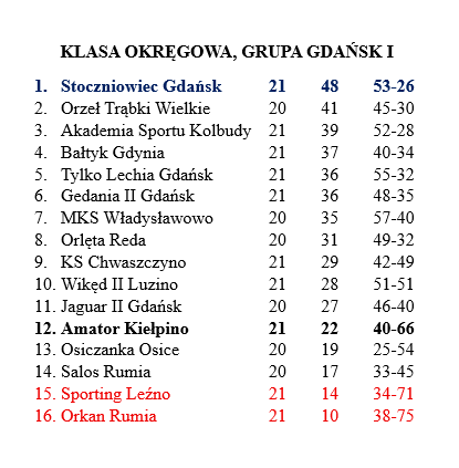 Na ten moment najsłabszymi drużynami w pierwszej grupie gdańskiej okręgówki są Orkan Rumia i Sporting Leźno. Pierwsza z nich zdobyła do tej pory jedynie dziesięć punktów, druga zaś ma na swoim koncie ich czternaście. Nad nimi jest kilka zespołów, które cały czas walczą o pozostanie na tym poziomie rozgrywkowym. Wśród nich jest Amator Kiełpino, dla którego jest to drugi sezon w okręgówce.