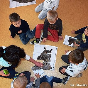 Sowy są bardzo "wdzięcznym" tematem dla tak małych odbiorców. Zajęcia rozpoczynały się zaprezentowaniem rzeźby puszczyka, na którym maluchy uczyły się poszczególnych części ciała ptaka i przystosowań sów do polowania oraz nocnego trybu życia. Dzieci nie mogły uwierzyć, że sowy potrafią usłyszeć bicie serca myszy, która jest schowana kilkanaście metrów dalej pod śniegiem, albo liśćmi, skoro one nawet nie potrafią usłyszeć bicia serca kolegi, który siedzi obok. Bardzo trafiona okazała się też zabawa ruchowa w polującą sowę. Uczestniczy biegnąc musieli machać rękami jak sowa skrzydłami i jednocześnie cały czas poruszać głową, jakby czemuś zaprzeczali. Zabawa miała obrazować sposób polowania sowy, mianowicie najpierw namierza ona swoją ofiarę wzrokiem, następnie lokalizuje ją słuchem lecąc w jej kierunku, a podczas lotu obraca głowę o 180 stopni, by zwiększyć pole nasłuchu.