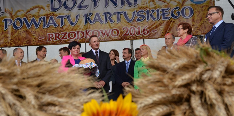 Mimo kapryśnej aury wyjątkowo radośnie było dziś w Przodkowie, gdzie odbyły się powiatowe dożynki. Dożynkowy bochen od starostów dożynek odebrali gospodarze uroczystości starosta Janina Kwiecień i wójt Przodkowa Andrzej Wyrzykowski.