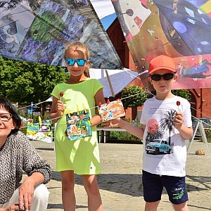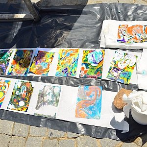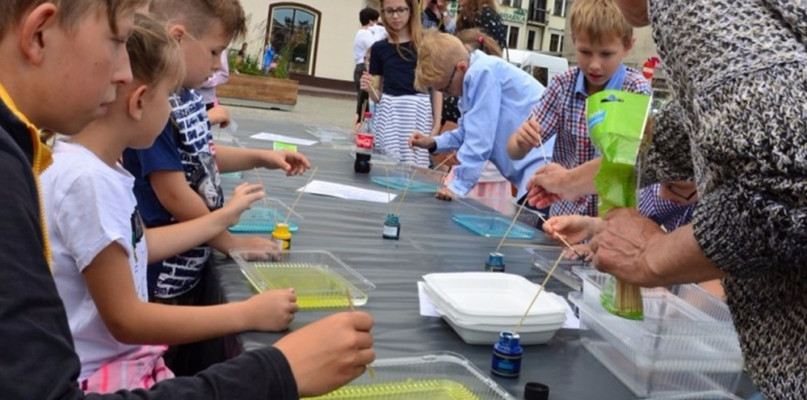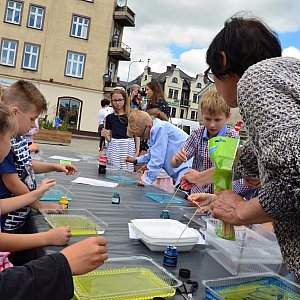 Dzieci i dorośli chętnie wzięli udział w warsztatach artystycznych przeprowadzonych przez Grażynę Kunicką. Pokazywała, jak malować na wodzie, wykorzystując w tym celu specjalne farby. Spod rąk uczestników warsztatów wyłaniały się różnobarwne dzieła.