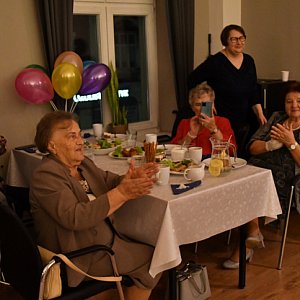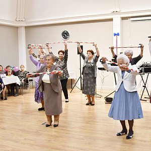 Panie uczestniczące w zajęciach tańca zaprezentowały świąteczny układ z laskami. Poradziły sobie znakomicie! Warto dodać, że wśród tancerek znajdują się trzy panie, które przekroczyły już 90 rok życia, a większość jest po... osiemdziesiątce!