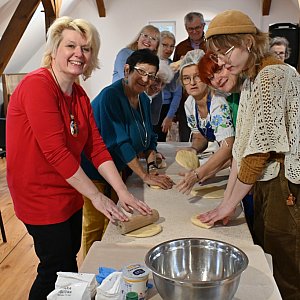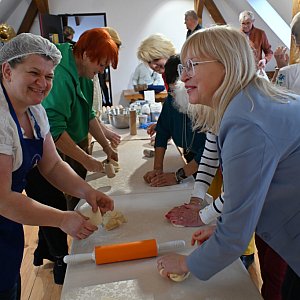 Po warsztatach w Muzeum Kaszubskim wiemy już, jak długo musi rosnąć drożdżowe ciasto na faworki i żeby przygotować ciasto na chrusty trzeba mieć w dłoniach wyjątkową krzepę, a nawet potraktować je... wałkiem. Swoim doświadczeniem z uczestnikami warsztatów dzieliły się panie z KGW Łyśniewo Sierakowickie "Czym chata bogata".