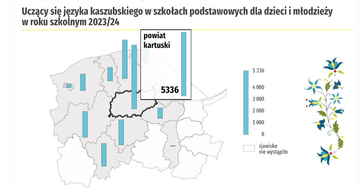 Z danych GUS wynika również, że powiat kartuski jest liderem, jeżeli chodzi o liczbę uczniów uczących się języka kaszubskiego. Na drugim miejscu jest pow. wejherowski, a na kolejnym bytowski.