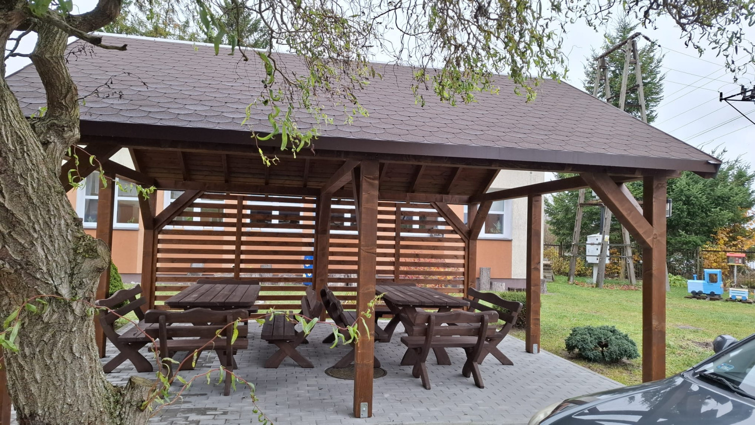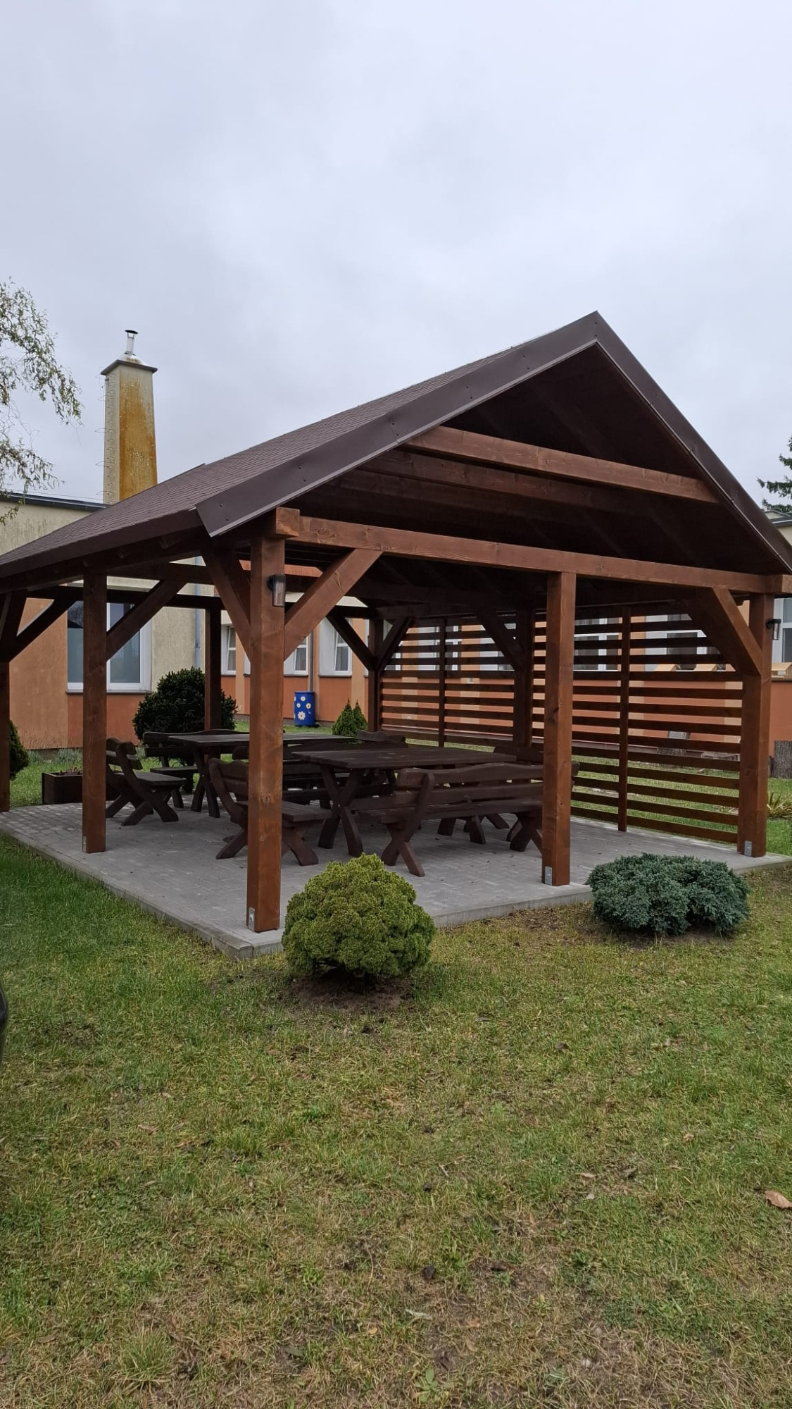 Nowo powstała drewniana wiata o wymiarach 6x5 metrów, pokryta gontem bitumicznym i pomalowana ekologicznymi farbami, to miejsce, w którym natura spotyka się z edukacją. Otoczona zielenią i obsadzona roślinami pnącymi, stanowi idealną przestrzeń do zajęć terenowych, warsztatów ekologicznych oraz spotkań społecznych.