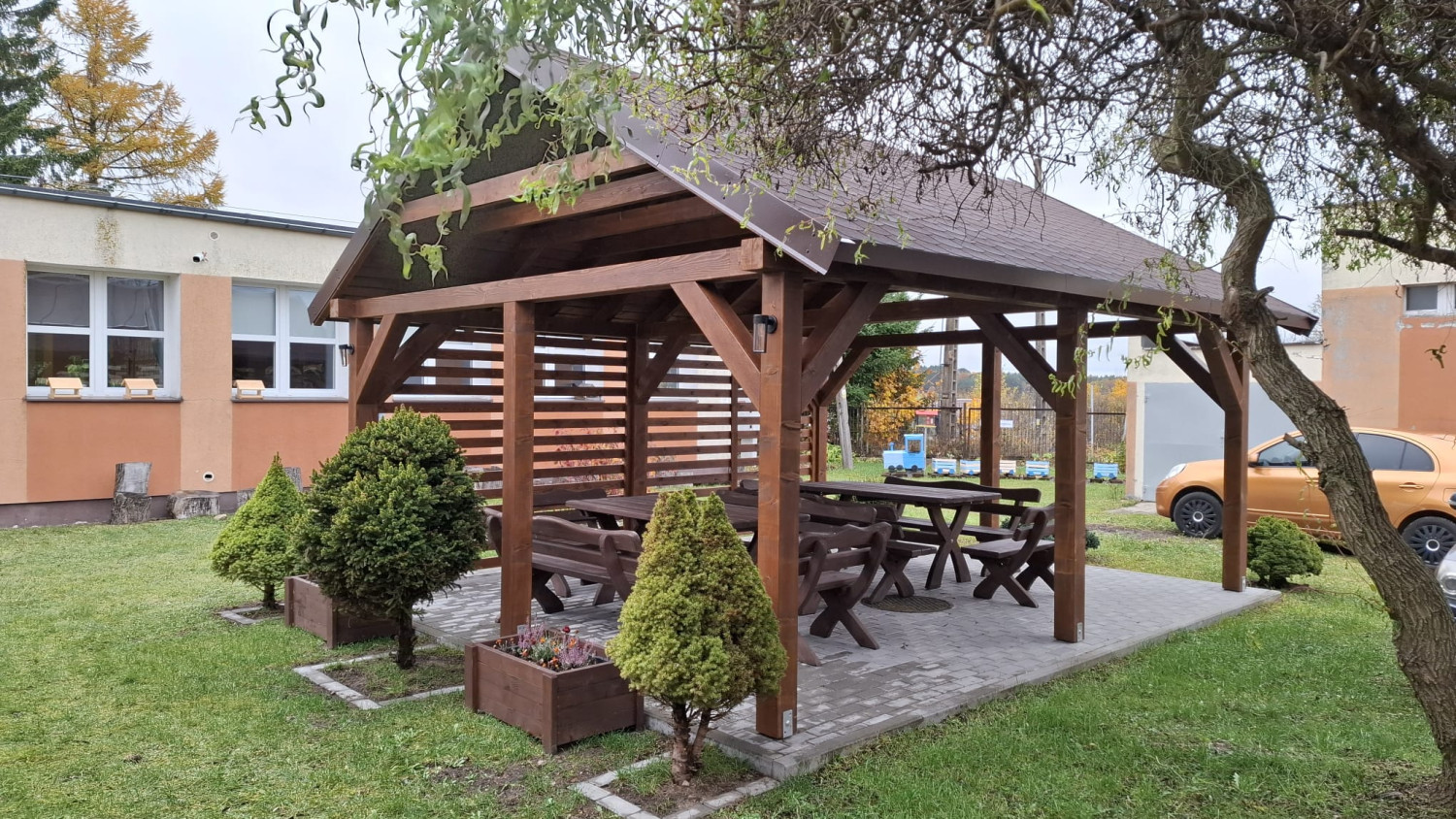 Altanę oświetlają lampy solarne, co czyni ją nie tylko funkcjonalną, ale też w pełni przyjazną środowisku. To przykład inwestycji, która pokazuje, że nowoczesna edukacja może iść w parze z troską o naturę.