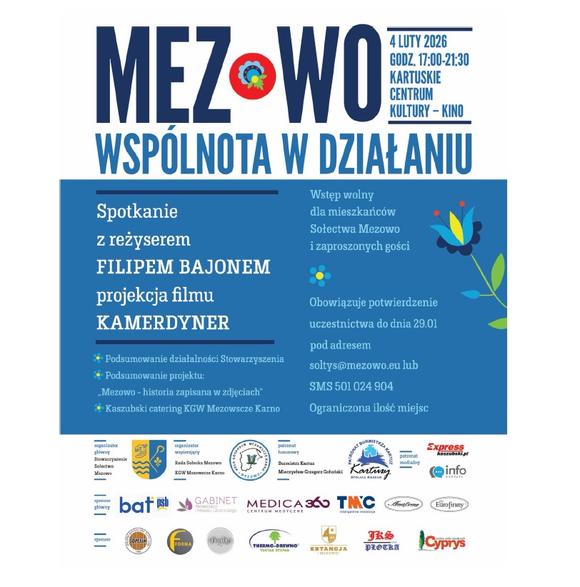 Za nami pierwszy rok działalności Stowarzyszenia Sołectwo Mezowo, podsumowaniem tego czasu było wydarzenie w KCK Kartuzy w dniu 04.02.2026. Opowiedzieliśmy o naszych dokonaniach i planach na 2026 rok. Wydarzenie zrealizowaliśmy dzięki pomocy Sponsorów i Partnerów wydarzenia.