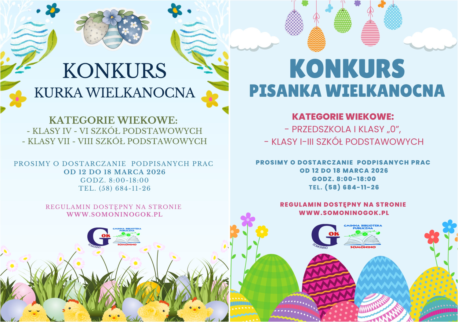 Gminny Ośrodek Kultury oraz Gminna Biblioteka Publiczna w Somoninie zapraszają dzieci i młodzież do udziału w kreatywnych konkursach plastycznych z okazji Wielkanocy.