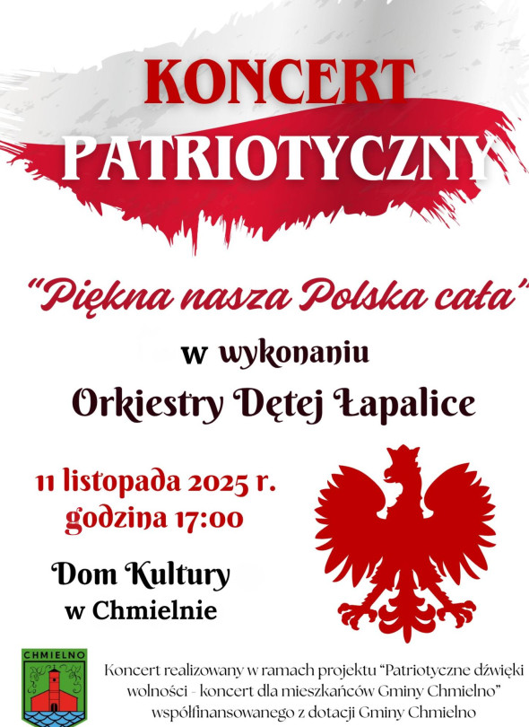 We wtorek 11 listopada o godz. 17.00 w Domu Kultury w Chmielnie odbędzie się koncert "Piękna nasza Polska cała" w wykonaniu Orkiestry Dętej z Łapalic. Wstęp wolny.