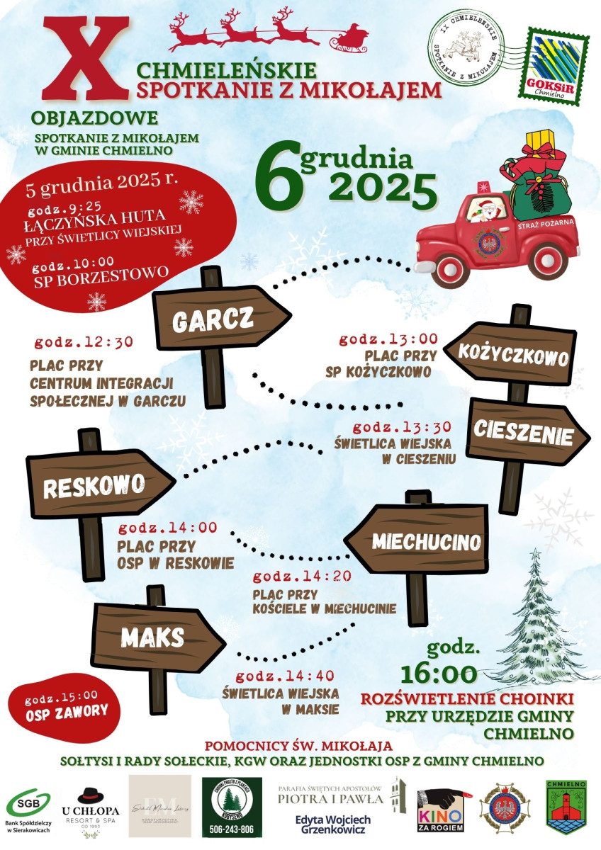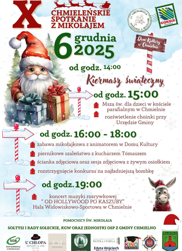 W gminie Chmielno także nie zabraknie świątecznej atmosfery. Około godz. 16.00 rozświetlona zostanie choinka w centrum miejscowości, a w Domu Kultury trwać będzie kiermasz i zabawa mikołajkowa. Wcześniej Mikołaj odwiedzi poszczególne miejscowości i wręczy najmłodszym upominki. Wieczorem w chmieleńskim Domu Kultury odbędzie się koncert muzyki rozrywkowej "Od Hollywood po Kaszuby".