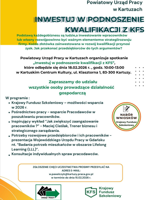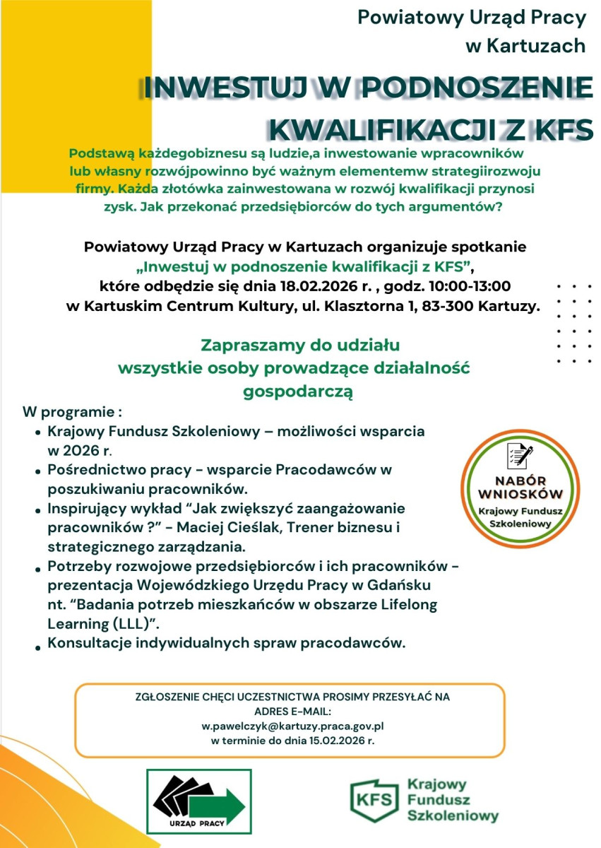 Powiatowy Urząd Pracy w Kartuzach organizuje spotkanie „Inwestuj w podnoszenie kwalifikacji z KFS”, które odbędzie się dnia 18.02.2026 r. , godz. 10:00-13:00 w Kartuskim Centrum Kultury, ul. Klasztorna 1, 83-300 Kartuzy. Zapraszamy do udziału wszystkie osoby prowadzące działalność gospodarczą