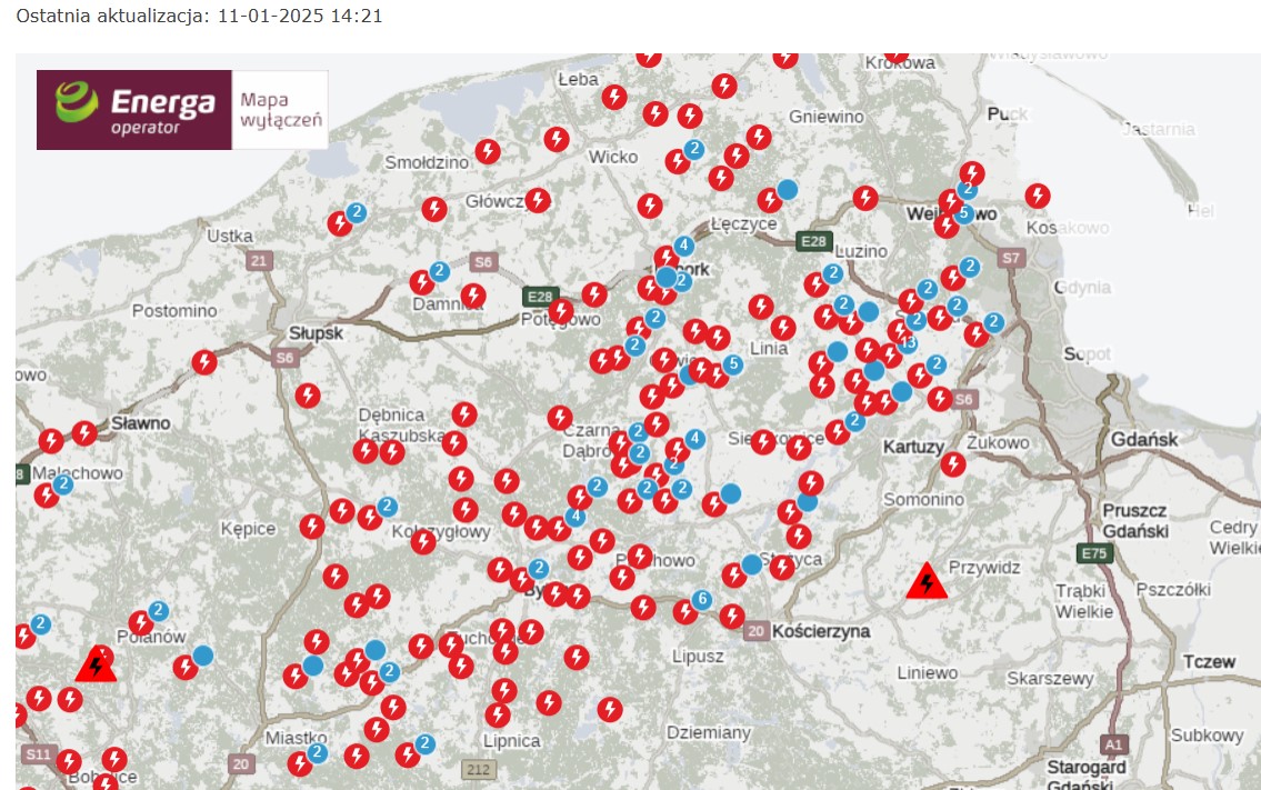 Wciąż "czerwono" jest na mapie Energi-Operator. Chodzi o ilość awarii. W tej chwili problemy z zasilaniem - w różnym zakresie - występują niemal we wszystkich gminach pow. kartuskiego. Z danych na godz. 14:21 wynika, że problemów nie ma w tej chwili w gm. Somonino.
